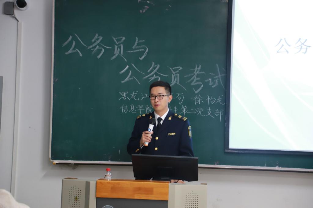为深入学习习近平总书记在“不忘初心、牢记使命”主题教育工作会议上的重要讲话精神,进一步落实党组织为广大群众办实事、办好事制度,经过精心策划与准备,信息学院本科生第二党支部邀请了我院2011届计算机科学与技术专业优秀毕业生,国家公务员考试笔试、面试考官,黑龙江海事局三级主任科员徐怡龙,于10月16日18时30分在丹青楼209成功举办了以“公务员与公务员考试”为主题的公益讲座。