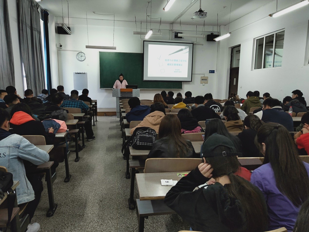 随后李老师向学生介绍了信息学院研究生管理规定。首先明确学生应该做到定期向导师进行学术汇报,然后对管理规定进行了进一步的介绍:学校研究生的奖励暂行办法、请销假制度、考试作弊处罚条款等相关内容。通过学院规章制度的具体介绍,让学生明确信息学院研究生管理的有关规定,进一步合理安排学习生活。