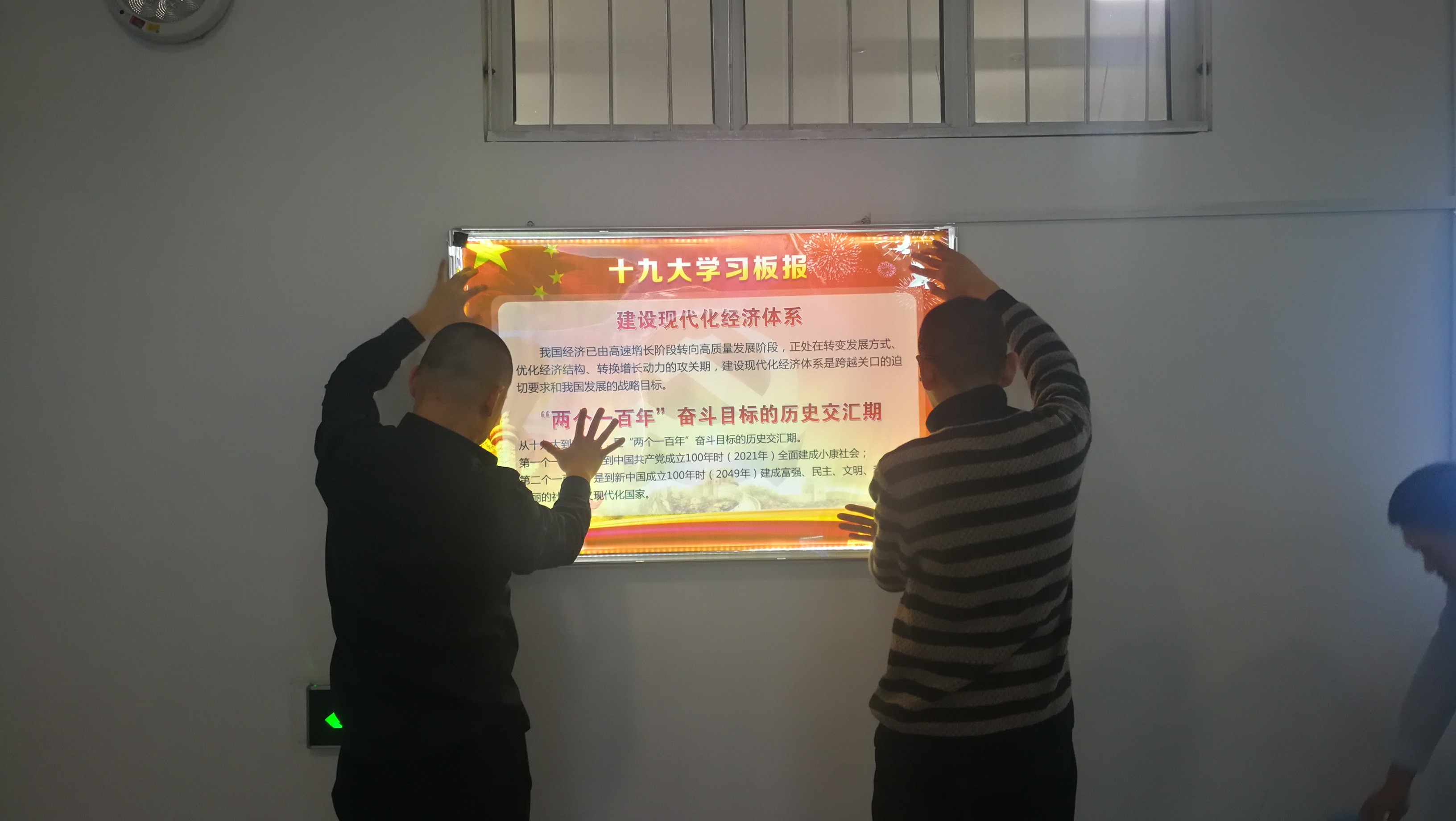 十九大召开以来,实验中心党支部在支部书记郭继峰的带领下进行认真学习和领会,以丰富多彩的方法和形式开展十九大报告精神的学习活动。12月14日至21日,支部组织党员开展十九大精神知识板报设计比赛活动,党员们精心准备素材,细致进行风格设计,将自己对十九大报告的理解和领会倾注于自己的板报作品中。21日下午,党员们亲自动手,认认真真地将精心制作的板报彩印图片安装在展板之内。根据学院党委要求,把学习十九大报告内容的板报放置在信息与计算机科学技术实验中心文化走廊的最显著位置,借助实验中心老师和学生人流量大,受众广的优势,占领宣传高地,牢牢把握学习宣传贯彻党的十九大精神的主线。