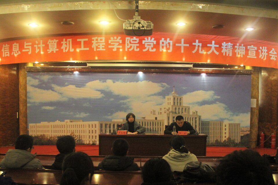 12月15日,为深入学习贯彻党的十九大精神和习近平新时代中国特色社会主义思想,信息学院在动资楼331国际会议厅举办党的十九大精神专题报告会,此次报告会特邀我校十九大精神宣讲团成员、马克思主义学院思想政治教育学科硕士生导师李忠艳教授作题为“我眼中的十九大”主题报告。本次报告吸引学院全体学生党员、学生干部共近270人到场聆听。