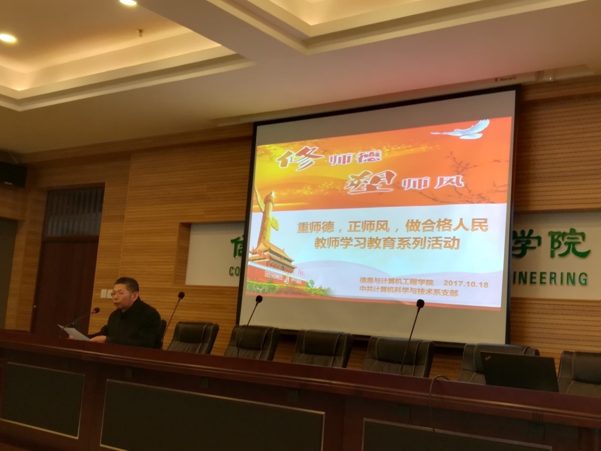 为贯彻落实习近平总书记在全国高校思想政治工作会议上的讲话精神,全面贯彻党的教育方针,进一步弘扬高尚师德,深入推进师德师风建设,信息与计算机工程学院于10月18日开展了“重师德,正师风,做合格人民教师”专题学习教育,本次活动由计算机科学与技术系党支部承办,学院全体教职工参加了活动。董本志副院长主持了本次活动。