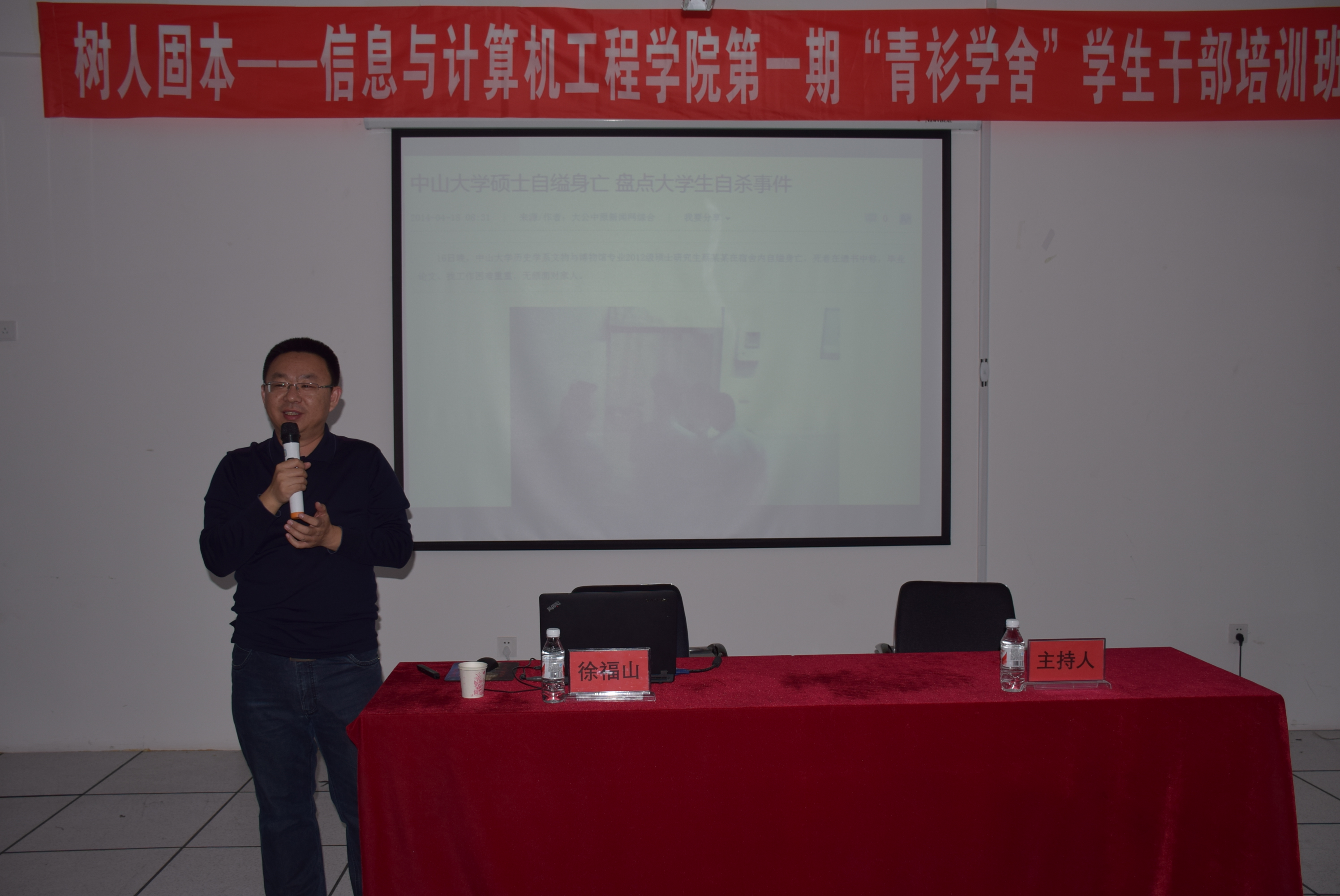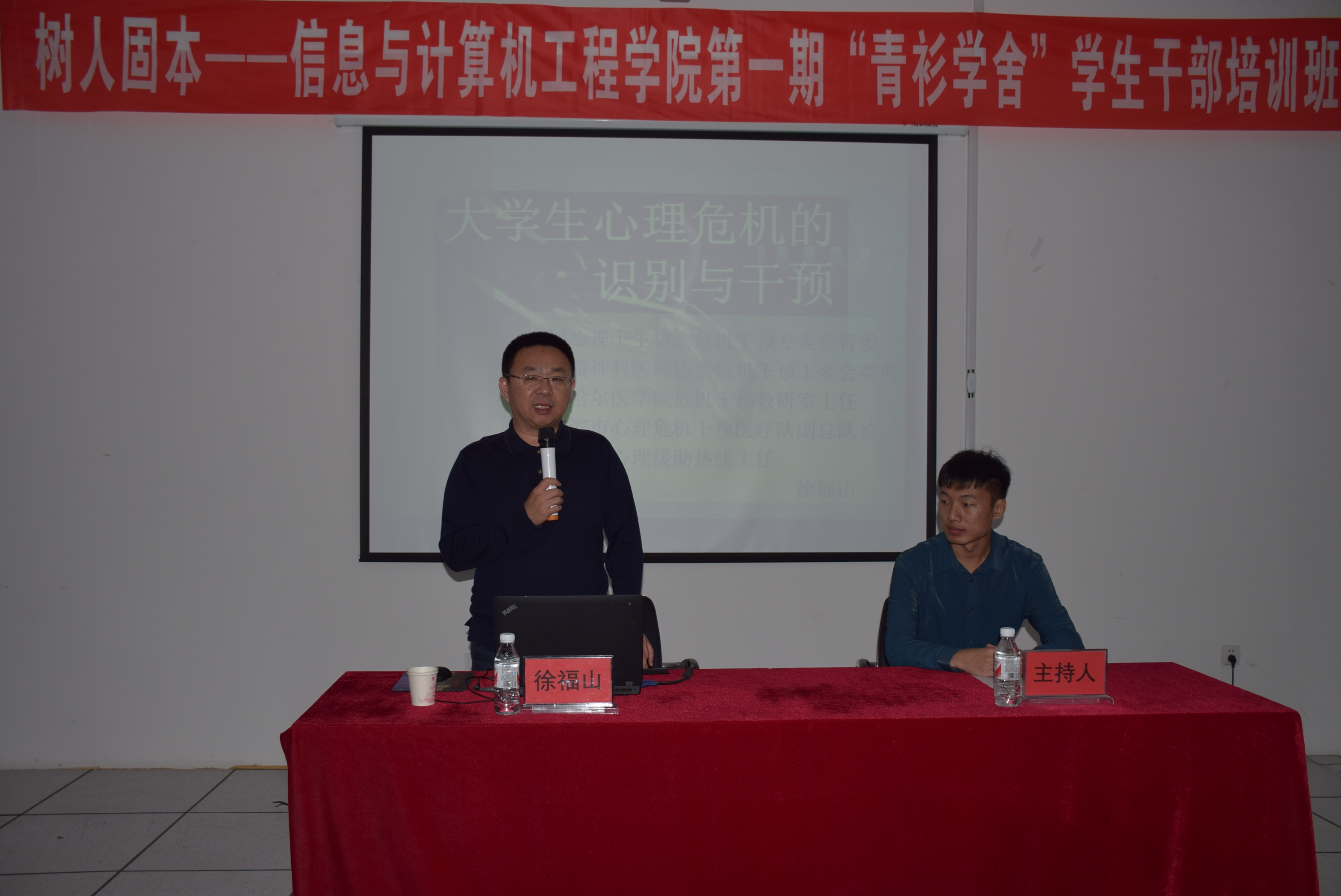 2016年10月25日18:00,信息与计算机工程学院心理健康教育中心在成栋楼1007室邀请到哈尔滨市第一专科医院徐福山教授为我院全体朋辈辅导员和研究生开展以“大学生心理危机应对技巧”为主题的专题讲座。本次讲座旨在关注大学生心理健康,增强朋辈辅导员业务能力,促进大学生健康发展。