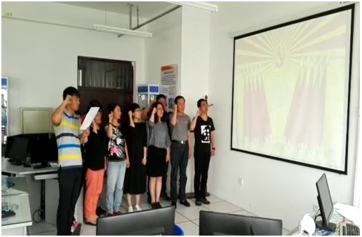 而后在国际歌的序曲声中,重温入党誓词活动正式开始,支部十名党员在领誓人党支部书记纪明宇同志的带领下,面对鲜红的党旗,郑重举起右手,庄严地向党宣誓:“我志愿加入中国共产党,拥护党的纲领,遵守党的章程,履行党员义务,执行党的决定,严守党的纪律,保守党的秘密,对党忠诚,积极工作,为共产主义奋斗终身,随时准备为党和人民牺牲一切,永不叛党。”铮铮誓言,表明了共产党员积极接受党性熏陶,矢志不渝地坚持党的理想信念的人生选择。