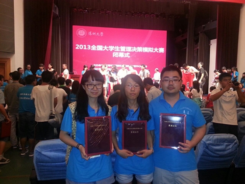 7月21-24日,由教育部国家级实验教学示范中心联席会主办的“2013全国大学生管理决策模拟大赛全国总决赛”在深圳大学举行。在刘欣老师的带领下,我校由宋雨同学担任CEO和张晶,邱胜彤三名同学共同组建的“Smile团队”与来自全国83所高校的88支代表队激烈角逐,最后获得全国总决赛一等奖的优异成绩。