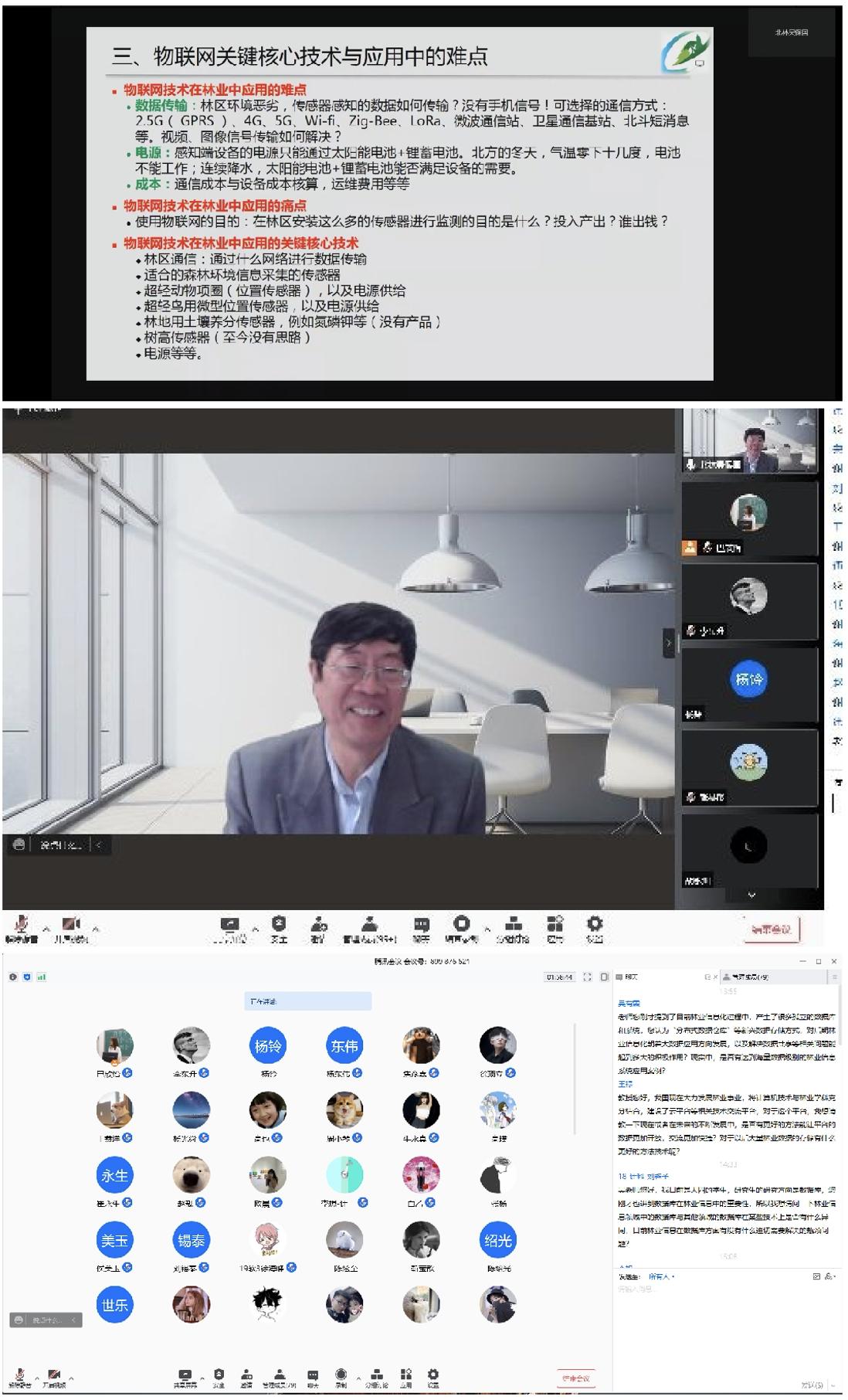 11月3日下午13:30,第一期活动通过腾讯会议平台顺利开展,活动邀请到北京林业大学吴保国教授作题为《林业信息化的关键技术与难点》专题报告,160余名学生参加会议。