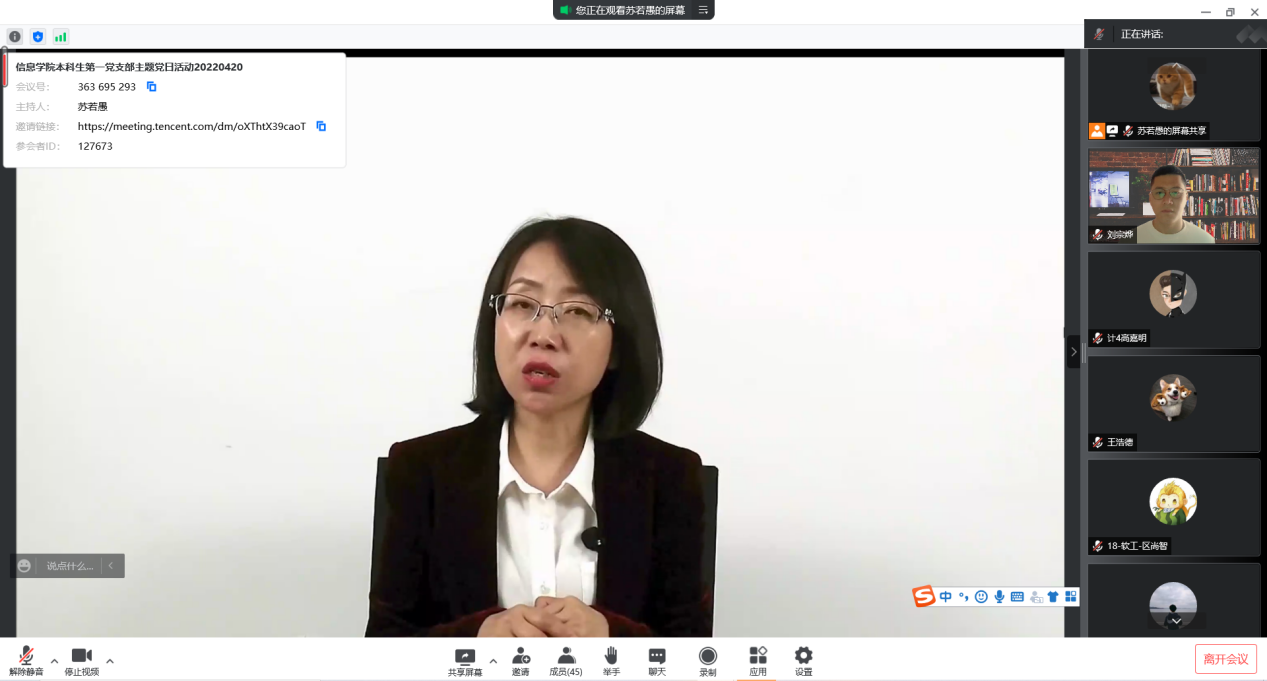 为深入学习领会党的十九届六中全会精神,引导全院师生深入学习领会党的十九届六中全会精神的丰富内涵和核心要义,2022年4月20日9时,信息学院党委组织全院师生线上集中观看“党的十九届六中全会精神宣讲——走进校园”直播活动。信息学院全院教职工线上集中开展政治理论学习,学生党支部采取线上线下方式参与学习。