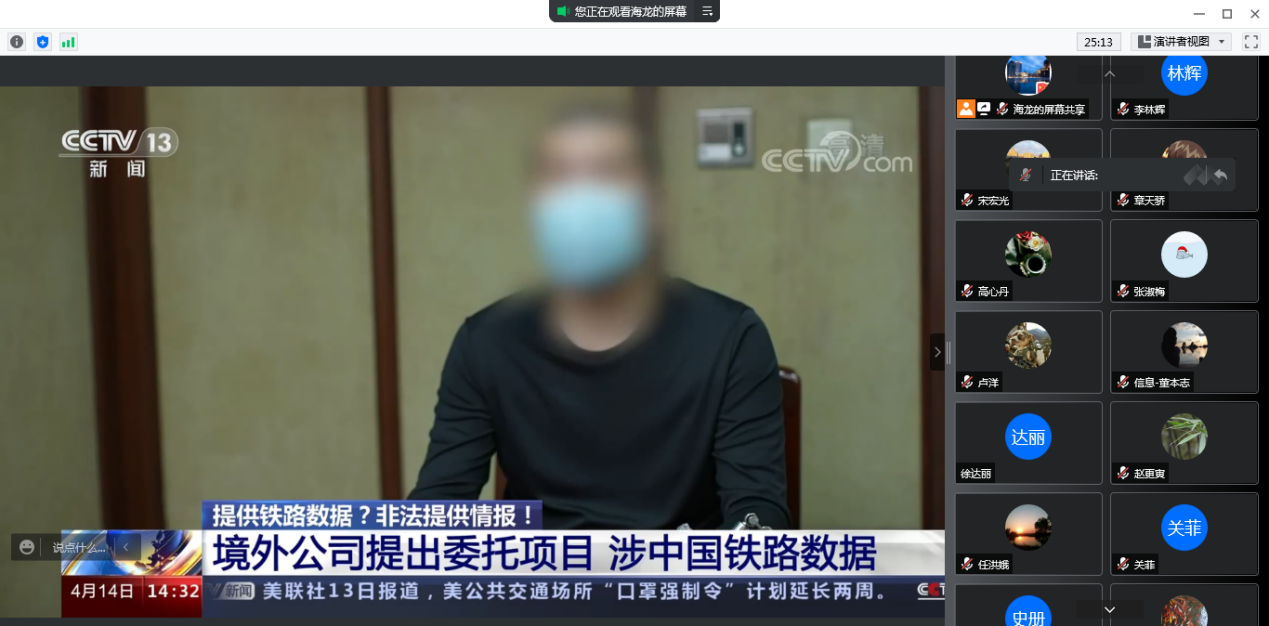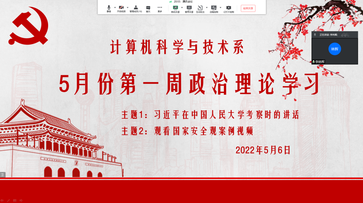 为深入学习习近平总书记在中国人民大学考察时重要讲话精神,落实立德树人根本任务,切实提高专业广大教职工的思想政治素质和国家安全观意识,2022年5月6日晚8:00,计算机科学与技术系党支部组织专业教师在线上开展了5月份第一周政治理论学习活动,集中学习了习近平在中国人民大学考察时强调的“坚持党的领导传承红色基因扎根中国大地走出一条建设中国特色世界一流大学新路”的讲话精神和国家安全观教育案例视频。本次学习活动由支部书记孙海龙主持,学习文件由支部宣传委员李林辉领学。