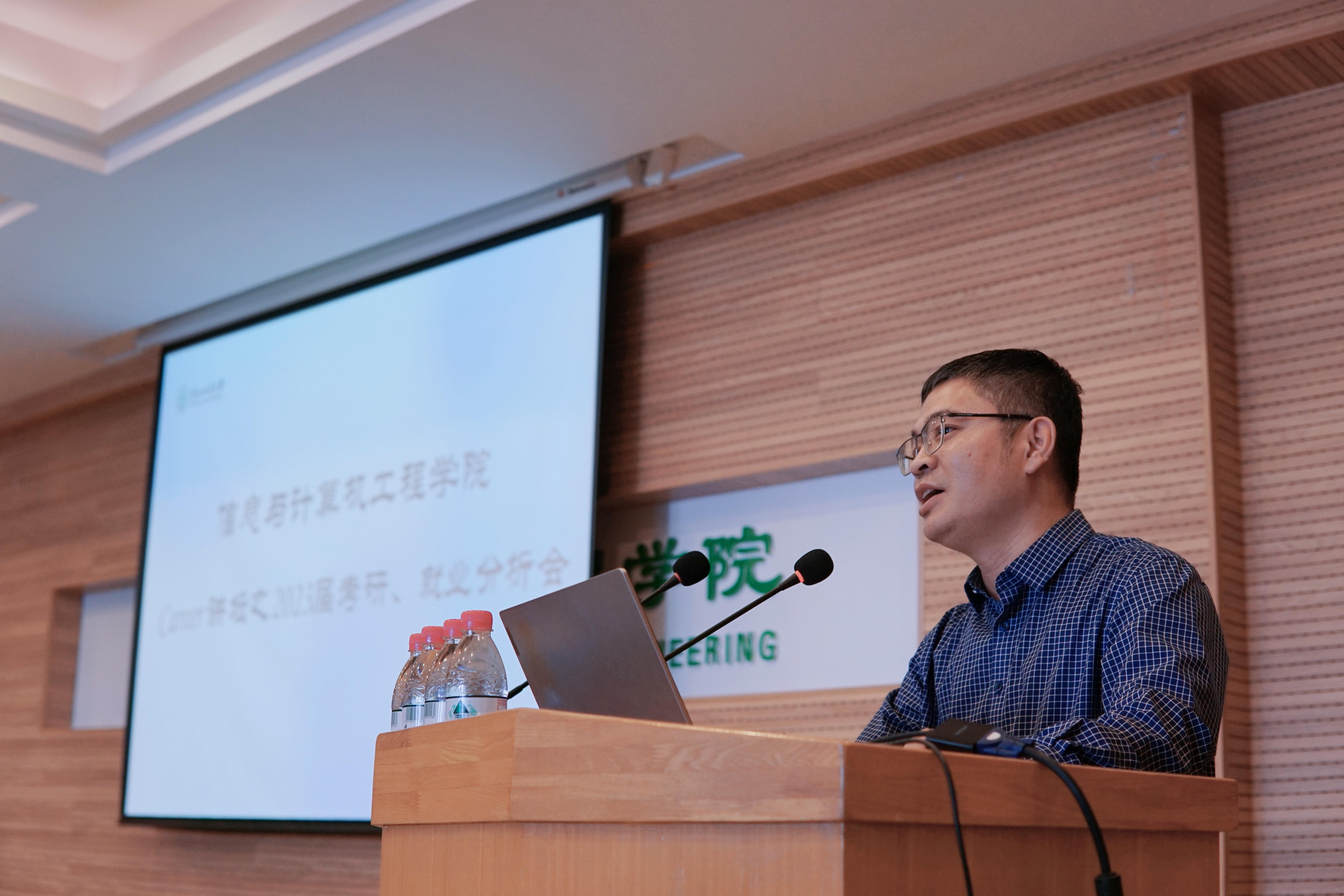 党委副书记、副院长庄雯培从考研就业形势的新变化、信息学院升学情况及考研应对策略、学生就业的前期准备这三个方面对当前考研和就业形势进行了系统全面地解读。通过对近五年学生考研、考公及留学的相关数据分析,针对当前考研竞争压力大、企业招人难、学生就业难、学生“慢就业”等一系列现状,庄书记为选择考研、就业等不同规划的同学提出了针对性的建议。她强调,就业与考研都是一场信息战,当前正处于“金九银十”的秋招的黄金阶段,她鼓励同学们广投简历,根据市场情况和个人实际找准就业定位,灵活调整就业方向,争取高质量就业。同时在考研备考上,她叮嘱同学们放平心态做好计划,要注重挖掘身边资源,合理利用资源,拓宽信息渠道。