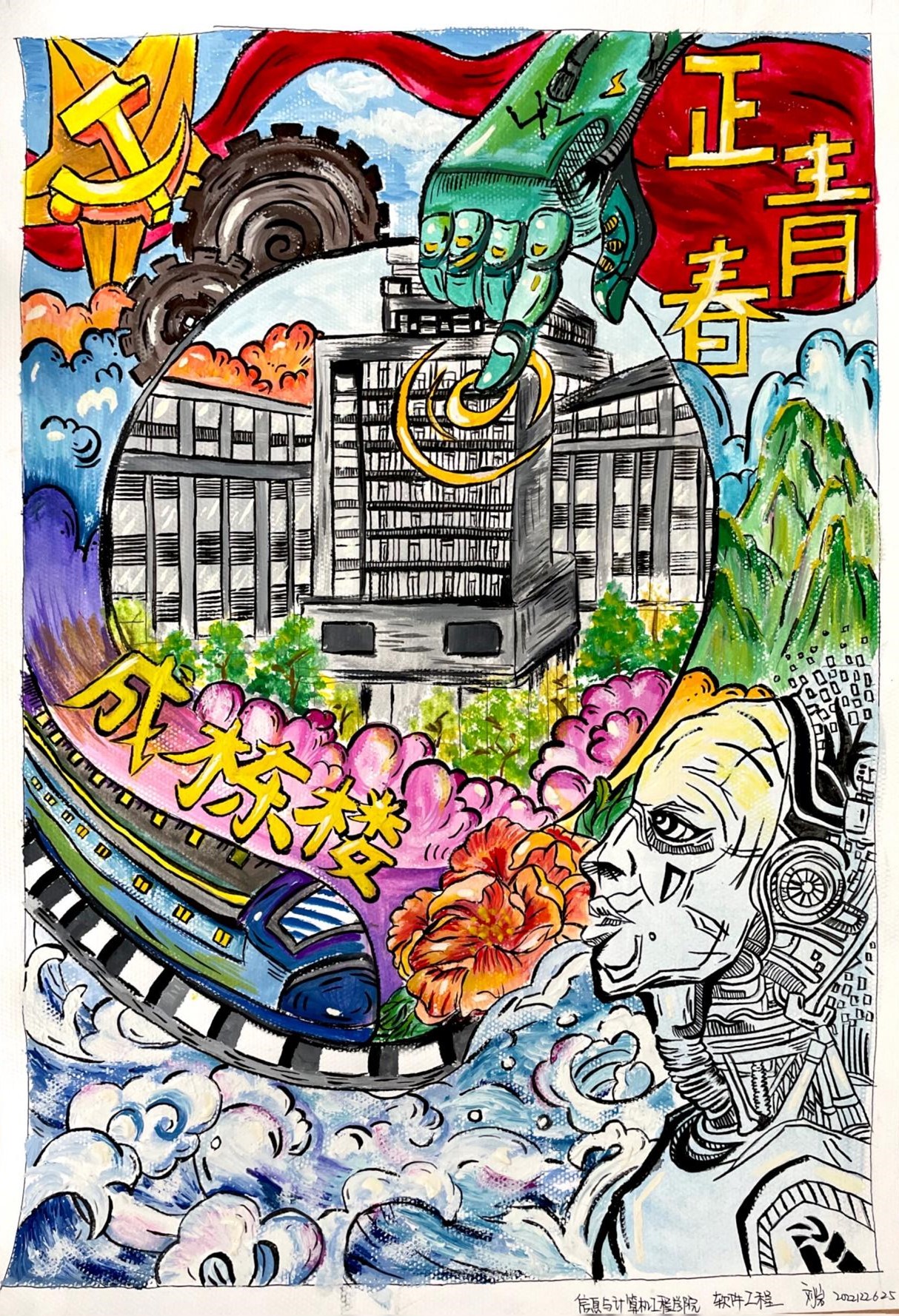 作品说明:本作品画面的中心是成栋楼,是我院学子每天学习、实验的地方,我们在此点燃青春,放飞梦想。党徽闪耀是朴素的信仰,点燃滚烫的星河,机器手臂与机器人相呼应表达了在我们共同的努力下,人工智能的发展会一路长虹。绿色基调突显绿色发展,使用新能源,绿水青山响应生态保护的号召,高铁飞驰,奏响时代发展的铿锵铁韵,流动中国,充满温度与动力。