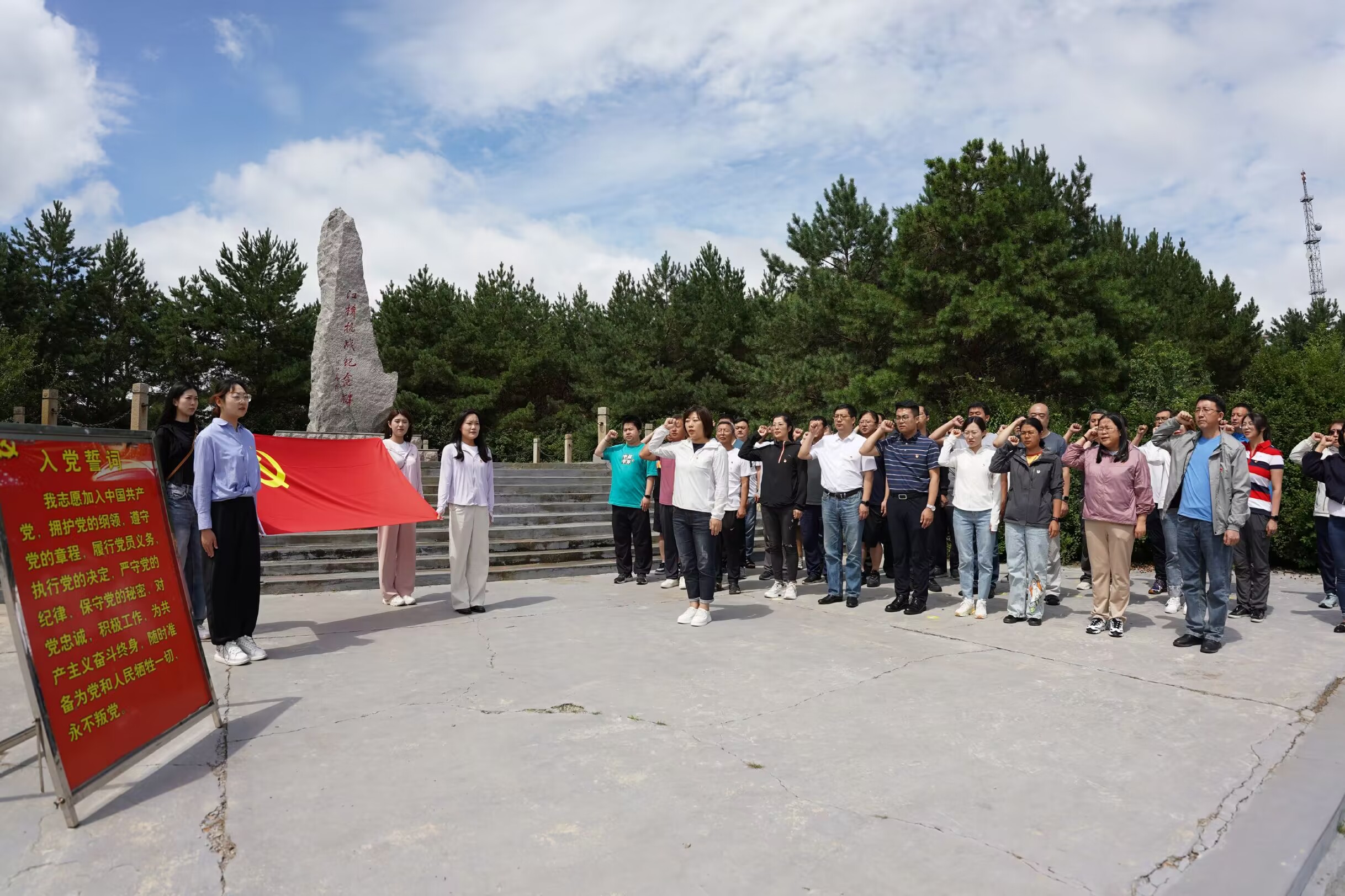 最后,全体党员在江桥抗战纪念碑前,面向鲜红的党旗,在党委书记钟蕾同志的带领下,一起举起右拳重温入党誓词,庄严宣誓。用铿锵有力的誓言铭记先烈感人事迹,弘扬江桥抗战精神,牢记共产党员初心和使命。