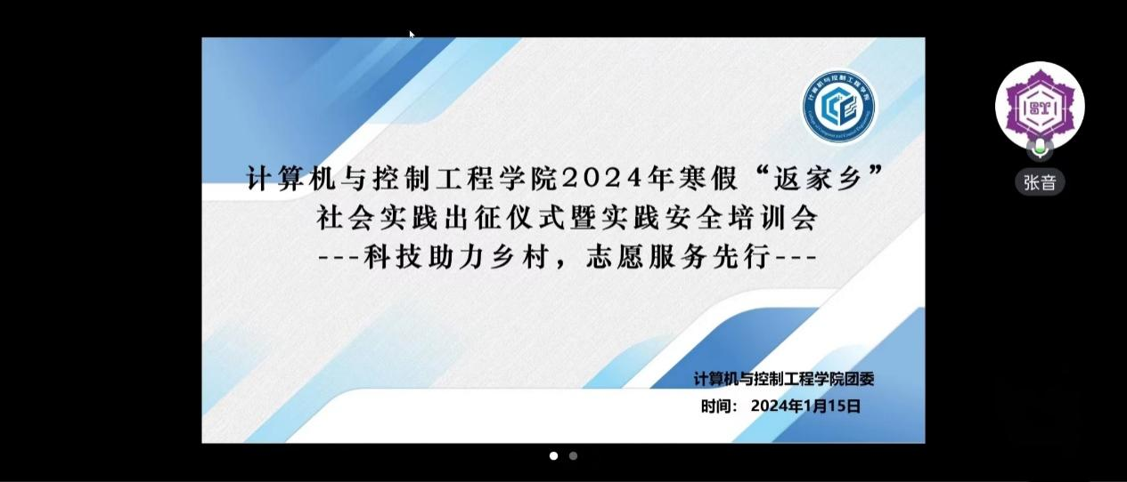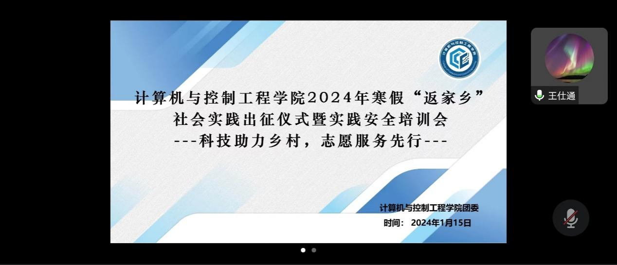 2024年1月15日19点,计算机与控制工程学院“科技助力乡村,志愿服务先行”2024年寒假“返家乡”社会实践出征仪式暨实践安全培训会在线上隆重召开,学院团委书记张音和团委副书记王仕通出席,近百余名实践团队师生代表参加本次出征仪式,会议由团委实践部部长李思贤主持。