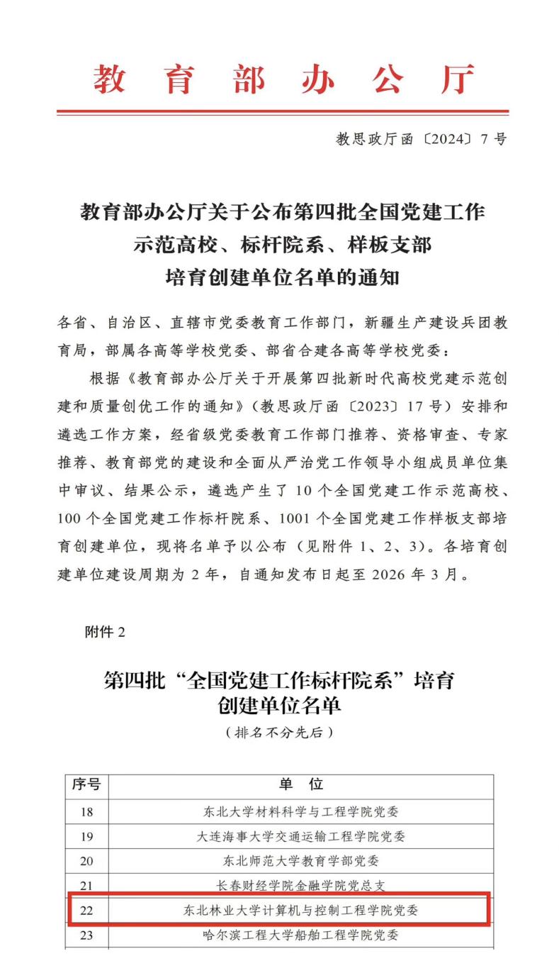 日前,教育部公布了第四批新时代高校党建示范创建和质量创优工作遴选结果,东北林业大学计算机与控制工程学院党委获批第四批“全国党建工作标杆院系”培育创建单位。