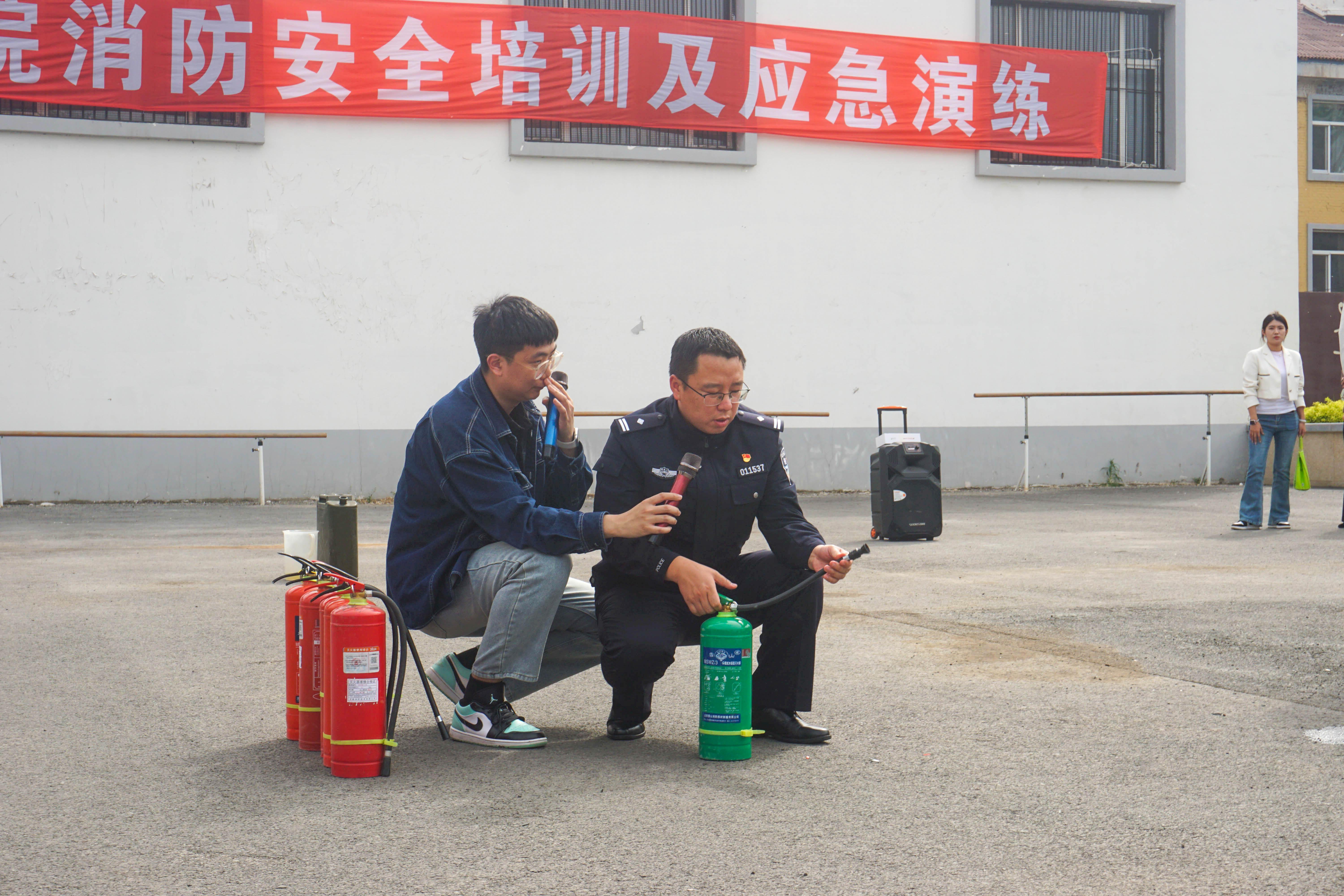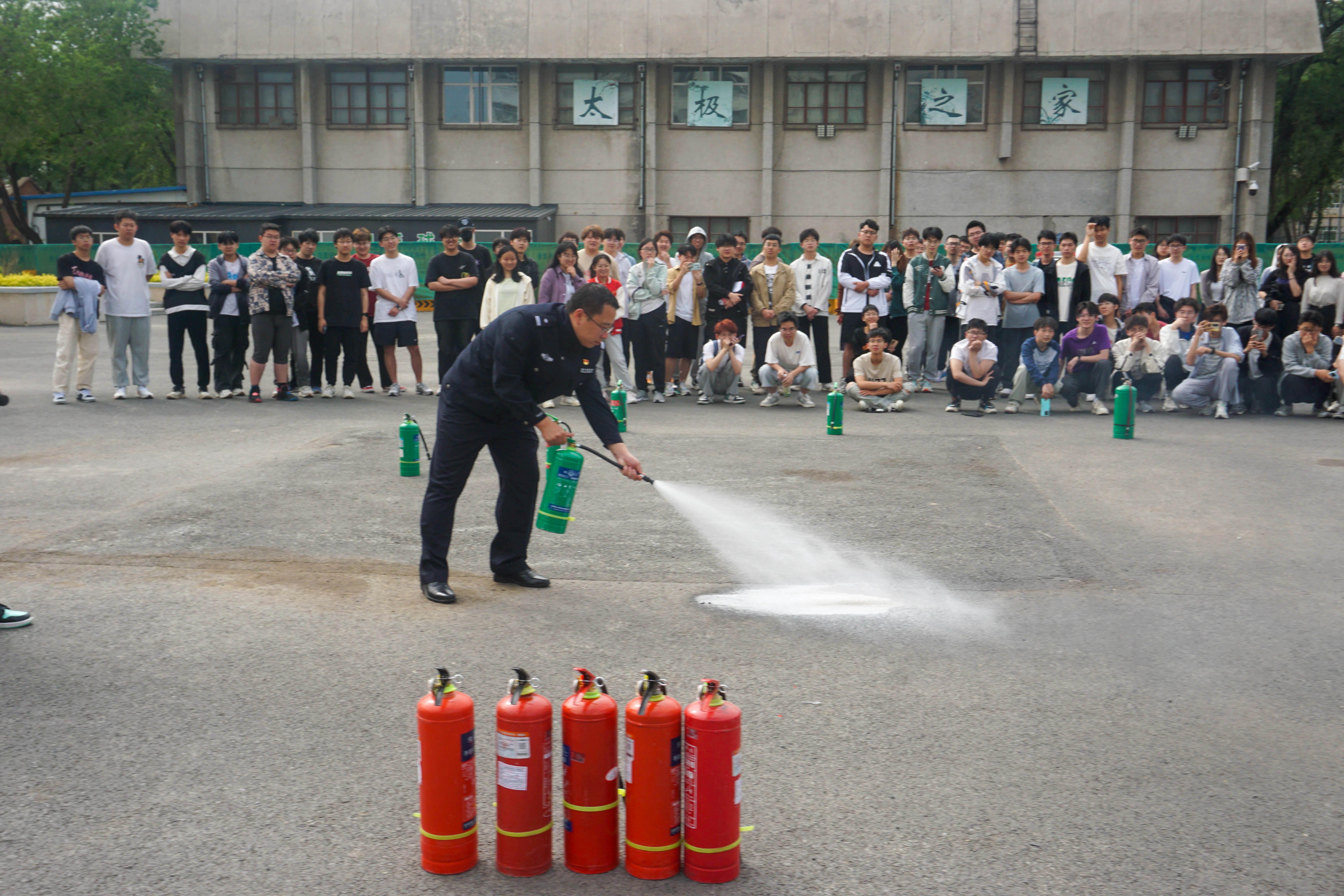 随后,王宇新对消防器材使用方法进行了讲解和实操,并一对一指导正确使用消防器材。讲解完成后,消防员点燃演练火源,师生每组10人按照“提、拔、瞄、喷”程序,在上风口距离明火3米距离操作灭火器灭火。