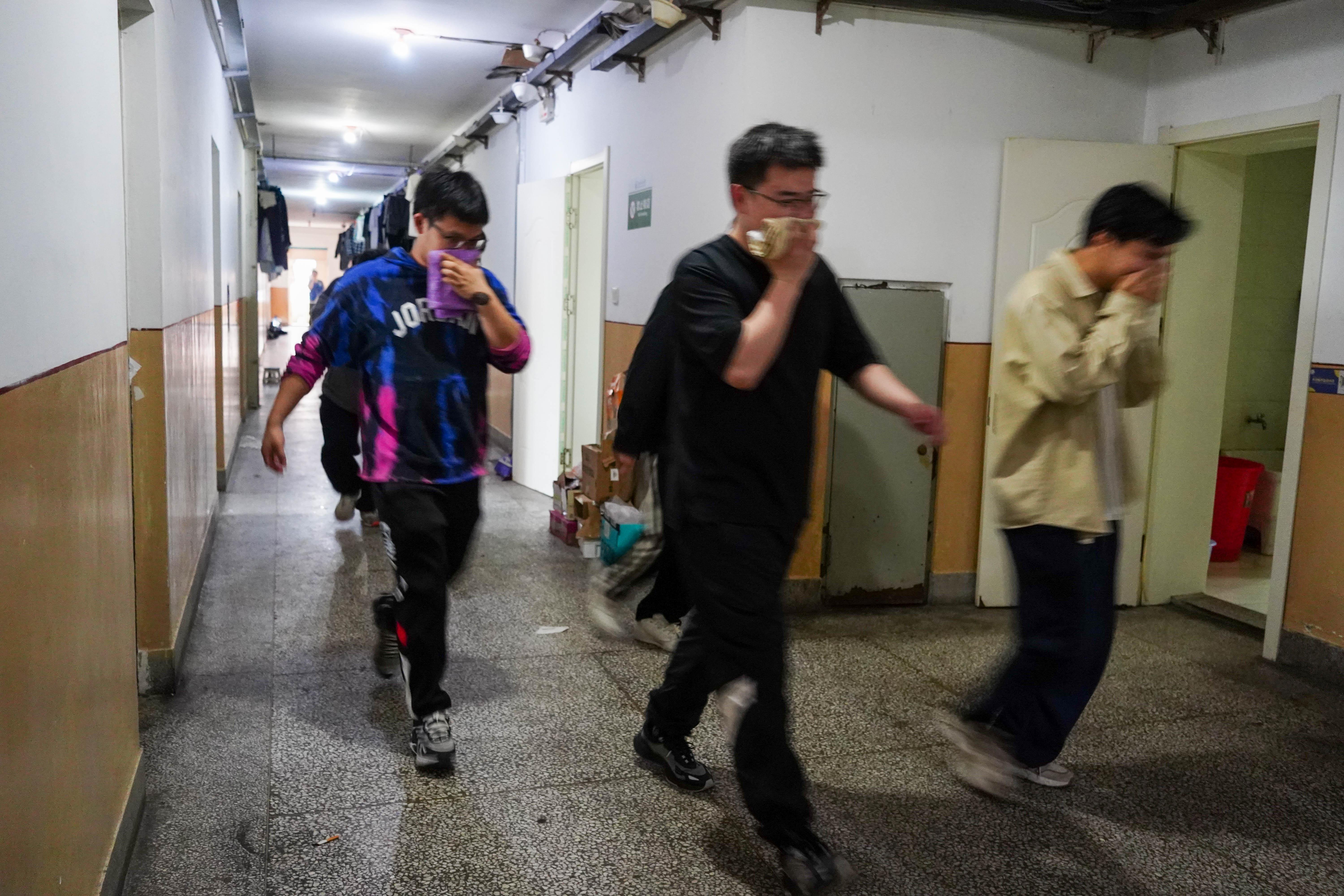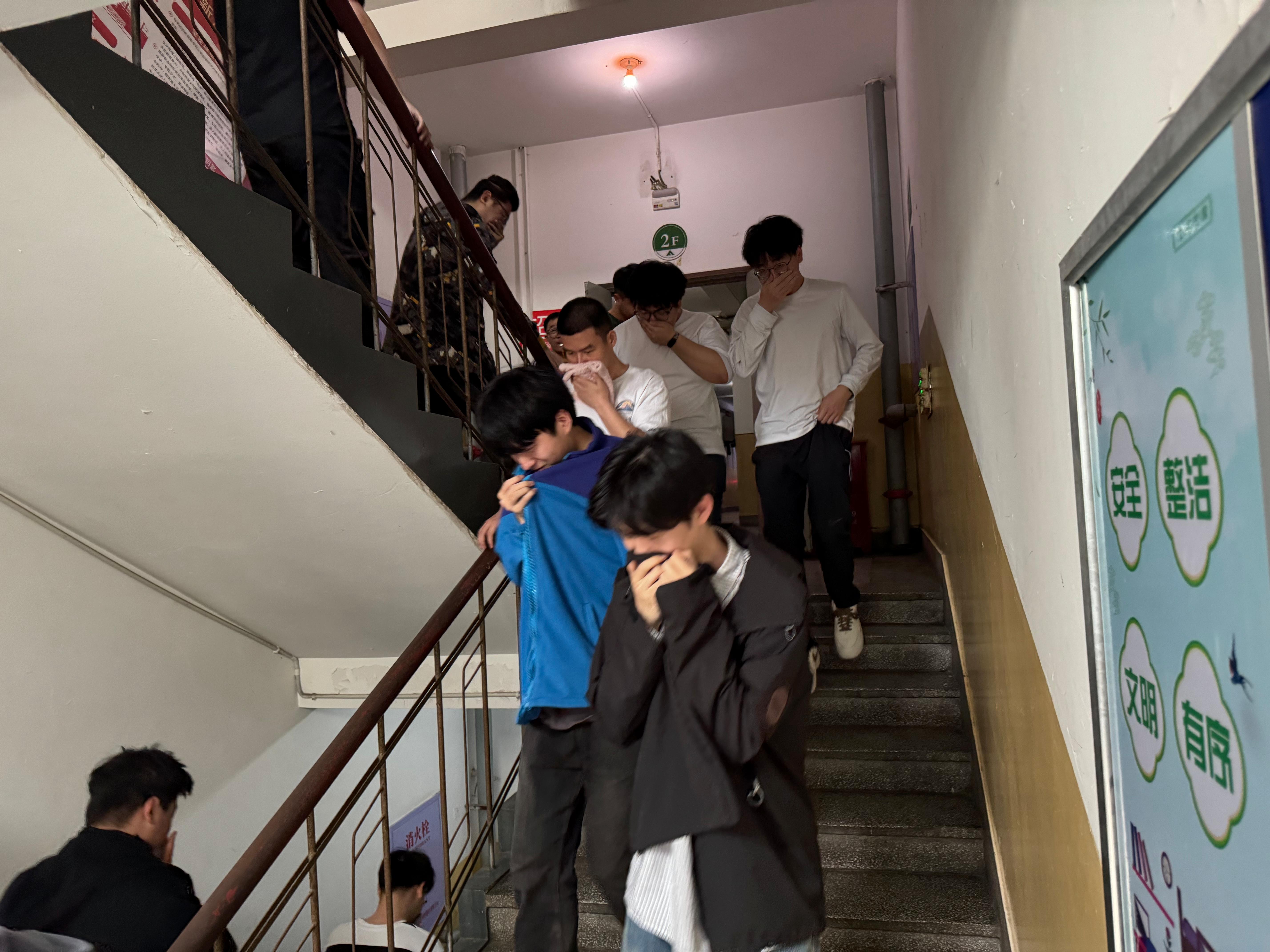 演练开始前,保卫处消防安全监督管理科负责人王宇新对火灾逃生疏散演练进行指导和讲解,他讲到面对火灾反应要迅速、行动要敏捷、决策要正确。下午14:10分,随着消防火灾警报声的响起,各楼层安全员迅速到达指定地点,沉着冷静地指挥学生用湿毛巾捂住口、鼻,尽量将身体放低,从安全疏散通道紧急撤离公寓楼。全体学生在指定时间内安全、快速、有序地撤离到了安全地点。