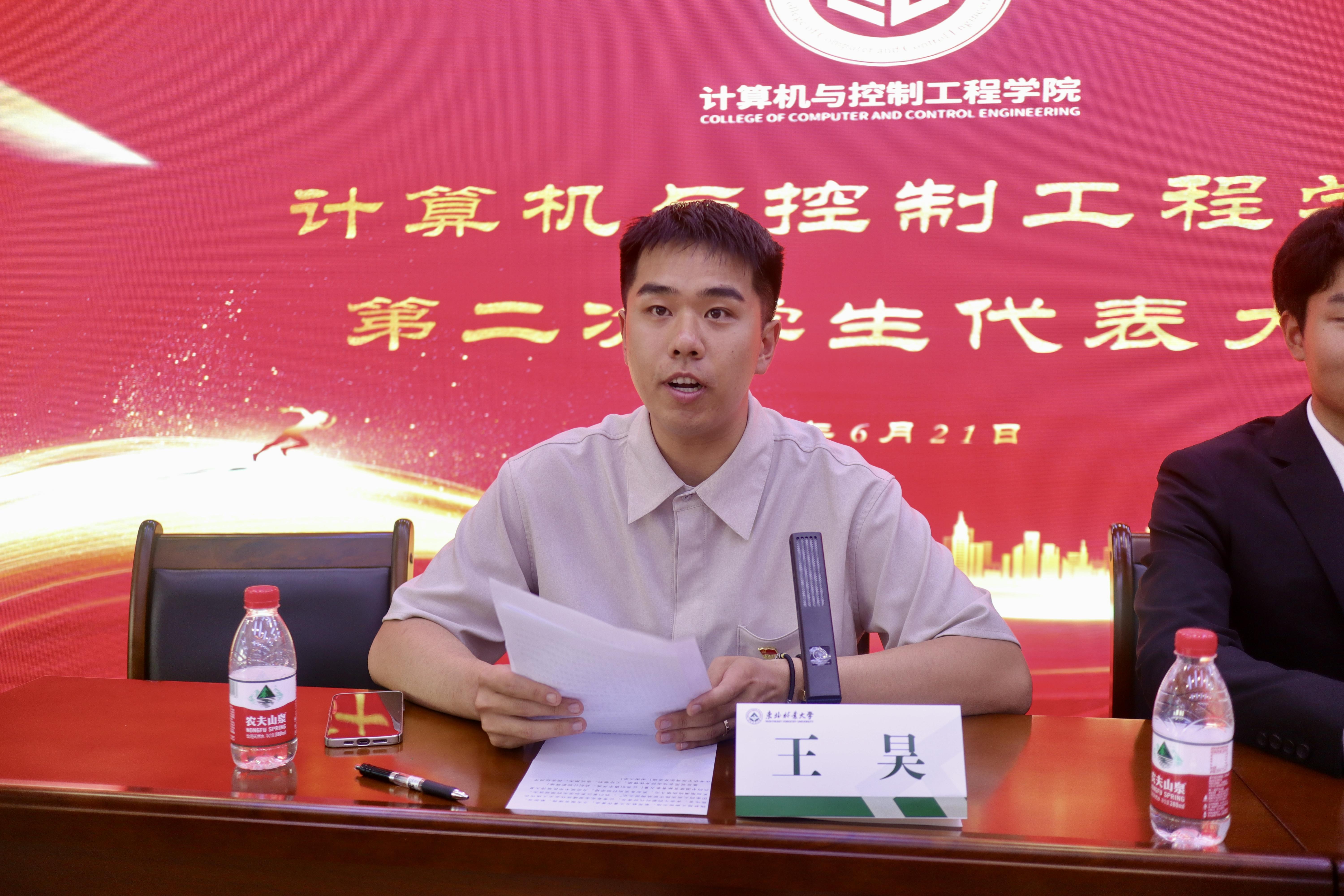 计算机与控制工程学院第一届学生会执行主席张永齐宣读《东北林业大学计算机与控制工程学院第一届学生会工作报告》。报告对学生会过去一年的工作进行了总结,回顾了一年里在各类校级活动当中的收获,并从进一步强化思想引领、加快学风建设进程,赓续劳动精神血脉等方面,对下一年工作做了规划展望。