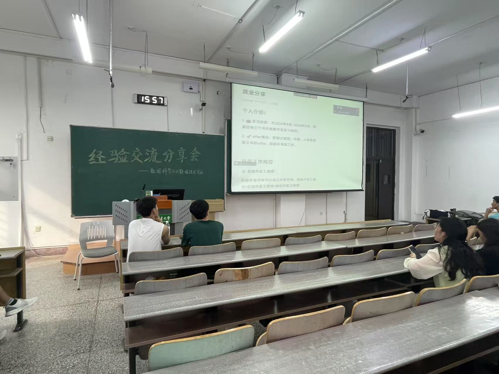 在就业经验分享环节,姜中洋和张宇涵分别讲述了自己就业到好未来公司和虾皮公司的经历。他们详细介绍了求职过程中的简历制作技巧、面试注意事项以及如何在众多求职者中脱颖而出的方法。姜中洋强调了实践经验在求职过程中的重要性,鼓励同学们积极参加项目实践,提升自己的专业技能和项目经验。张宇涵则分享了如何通过网络平台寻找合适的求职信息,以及在面试中如何展现自己的优势和对公司的了解。他们的分享让同学们对就业市场有了更清晰的认识,也为同学们提供了实用的就业技巧。