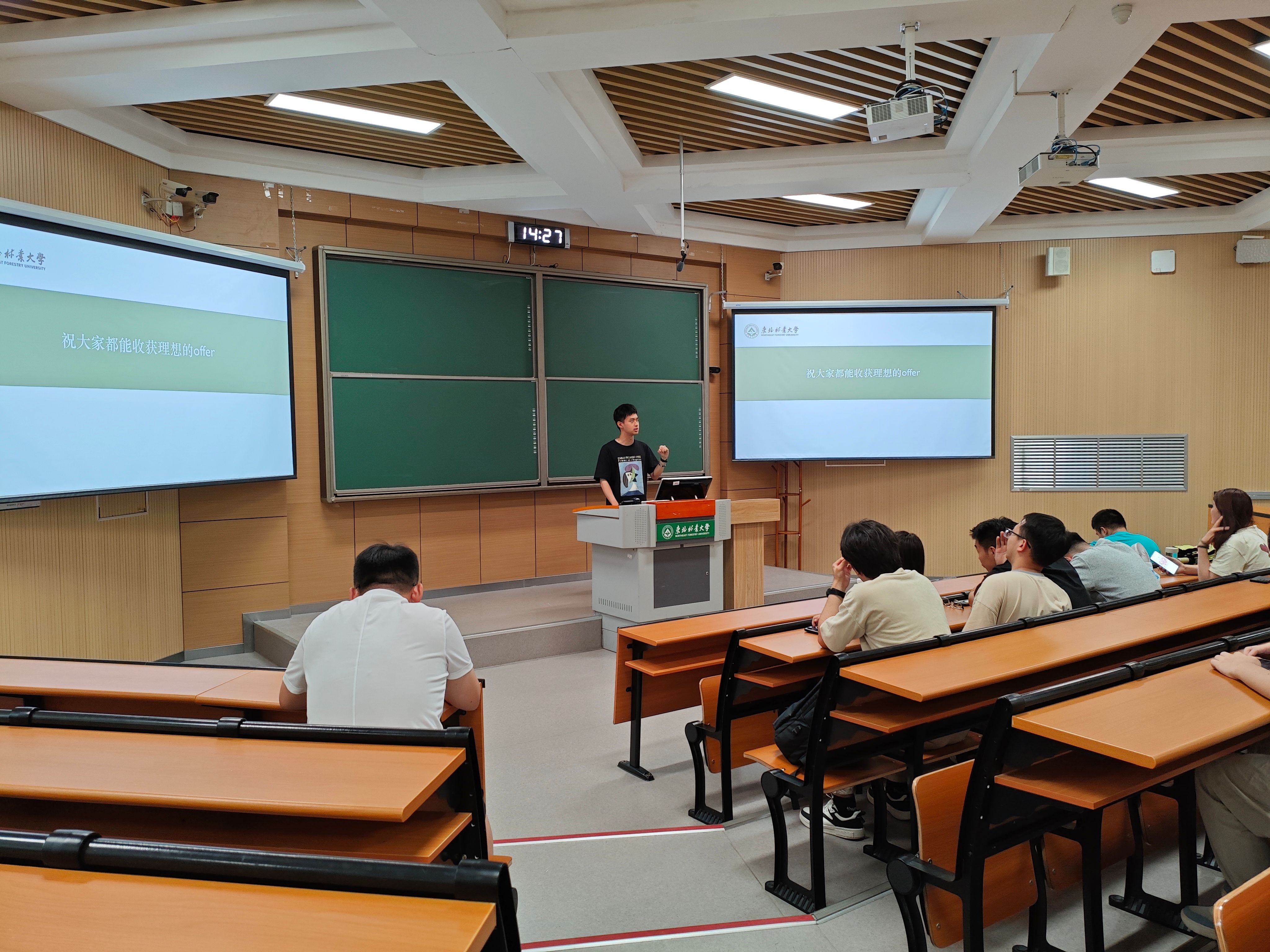就业分享环节中,入职国家电网的赵文瑞对新能源领域以及国家电网就业经验进行分享,以其自身的就业求职经历缓解了学弟学妹的就业焦虑,重点强调了408课程在就业中的重要性以及211高校在就业过程中的金字招牌效应。拟就职北京掌上天梯杭州分公司的伦佳宇建议学弟学妹们需要明确自己的就业方向,并说明了本科生就业过程中实习经历以及高情商的重要性,要学会与面试官沟通。