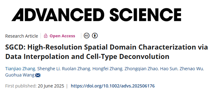 近日,我校计算机与控制工程学院生物信息学实验室章天骄副教授团队在生物空间组学超分辨率数据研究领域取得重要突破,提出了一种基于数据插值和细胞类型反卷积的高分辨率空间域表征新方法SGCD。相关成果以“SGCD: High-Resolution Spatial Domain Characterization via Data Interpolation and Cell-Type Deconvolution”为题发表于Advanced Science(中科院1区TOP期刊,影响因子14.1)期刊上。