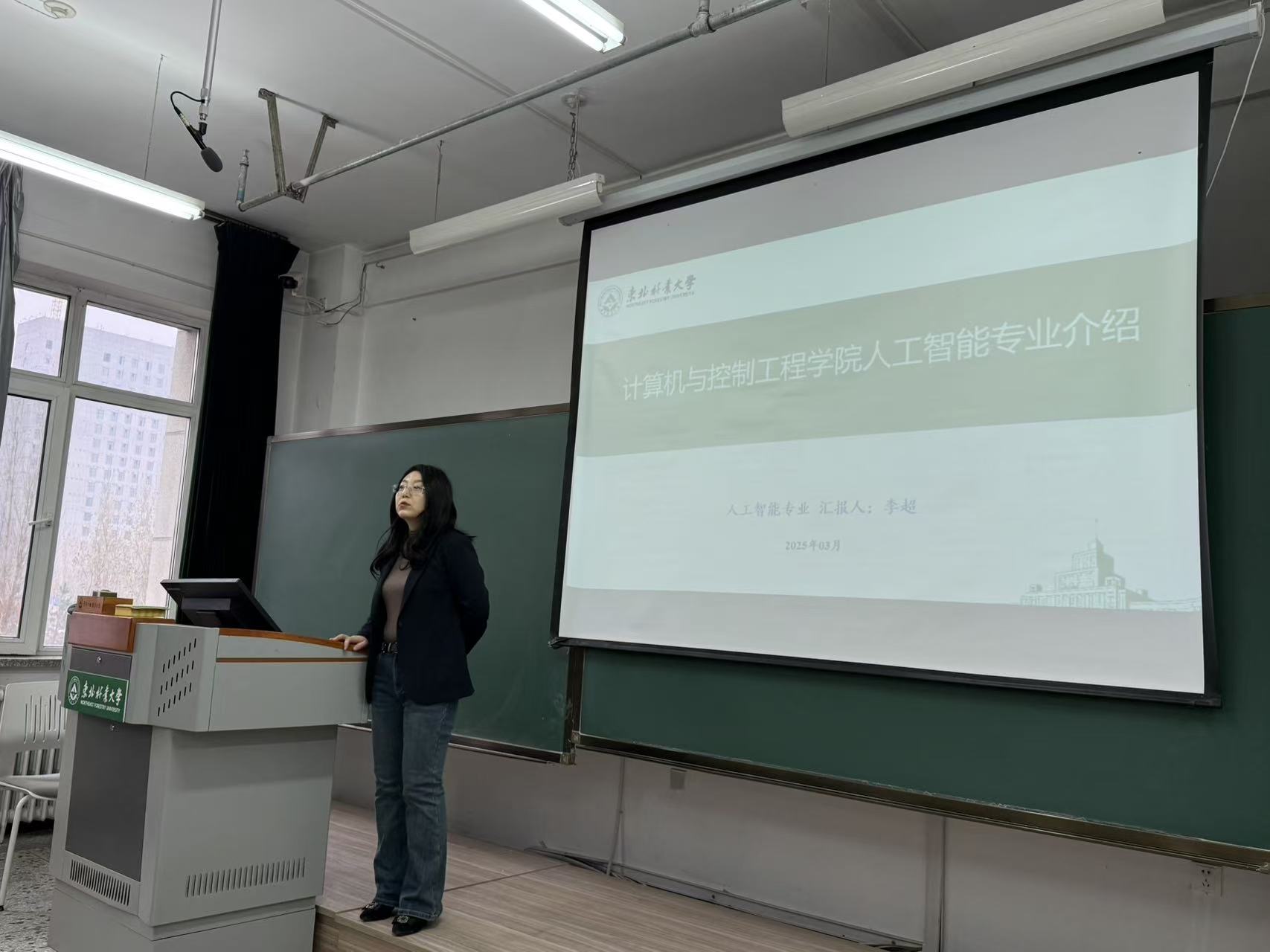 会议伊始,李超主任首先对加入人工智能大家庭的新生们表示热烈欢迎。随后,她围绕专业背景、专业特色、师资力量、课程体系、项目竞赛成果以及升学就业情况等方面,进行了全面而深入的介绍。李主任详细阐述了人工智能领域的发展前景与本专业的培养优势,展示了雄厚的师资队伍与科学完善的课程设置,并分享了往届学生在各类竞赛中取得的优异成绩及广阔的升学和就业出路,极大地增强了新生对所学专业的认同感与自信心。