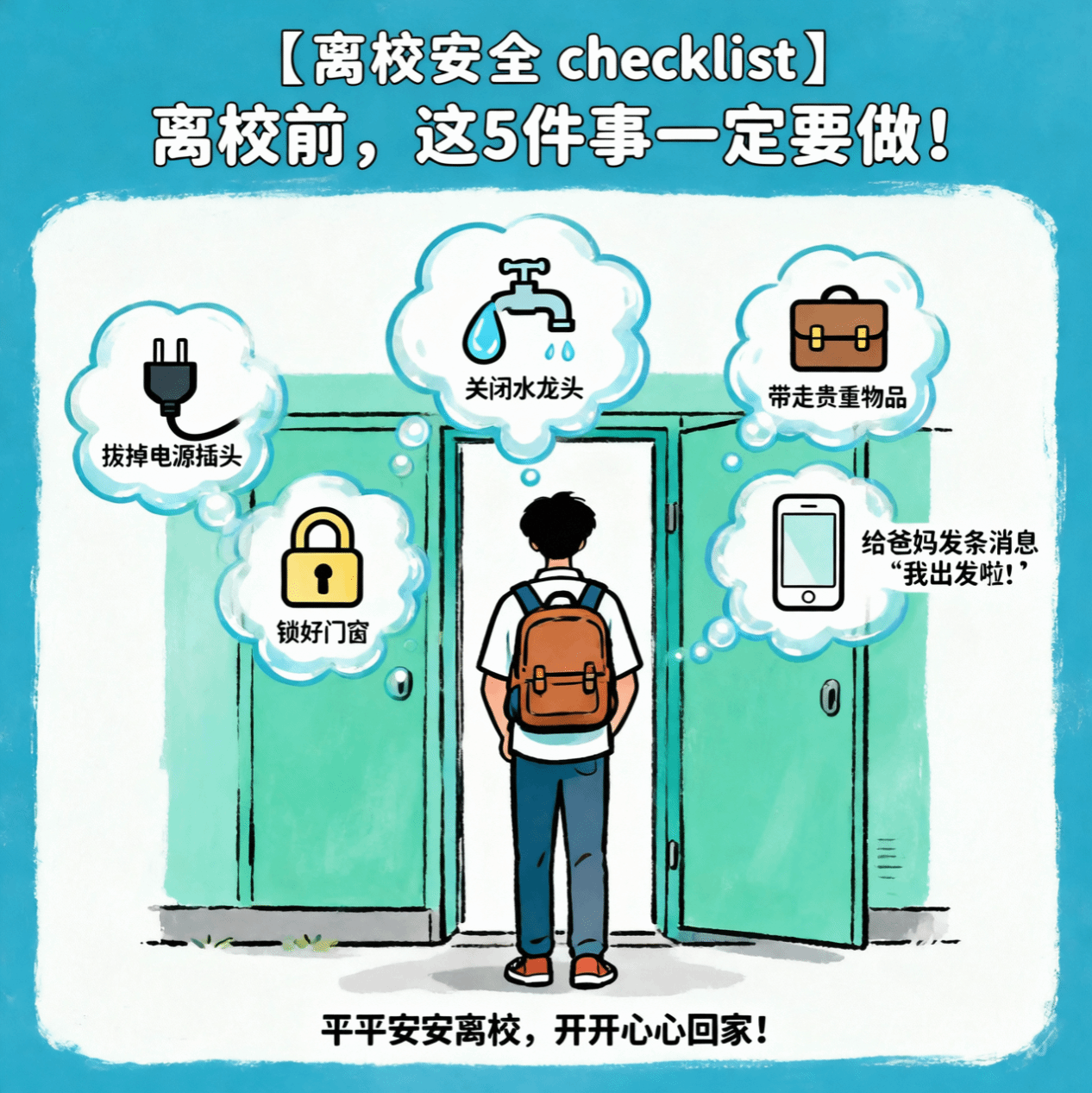 1.整理宿舍:关闭电源、水源,锁好门窗,贵重物品随身携带或妥善存放。