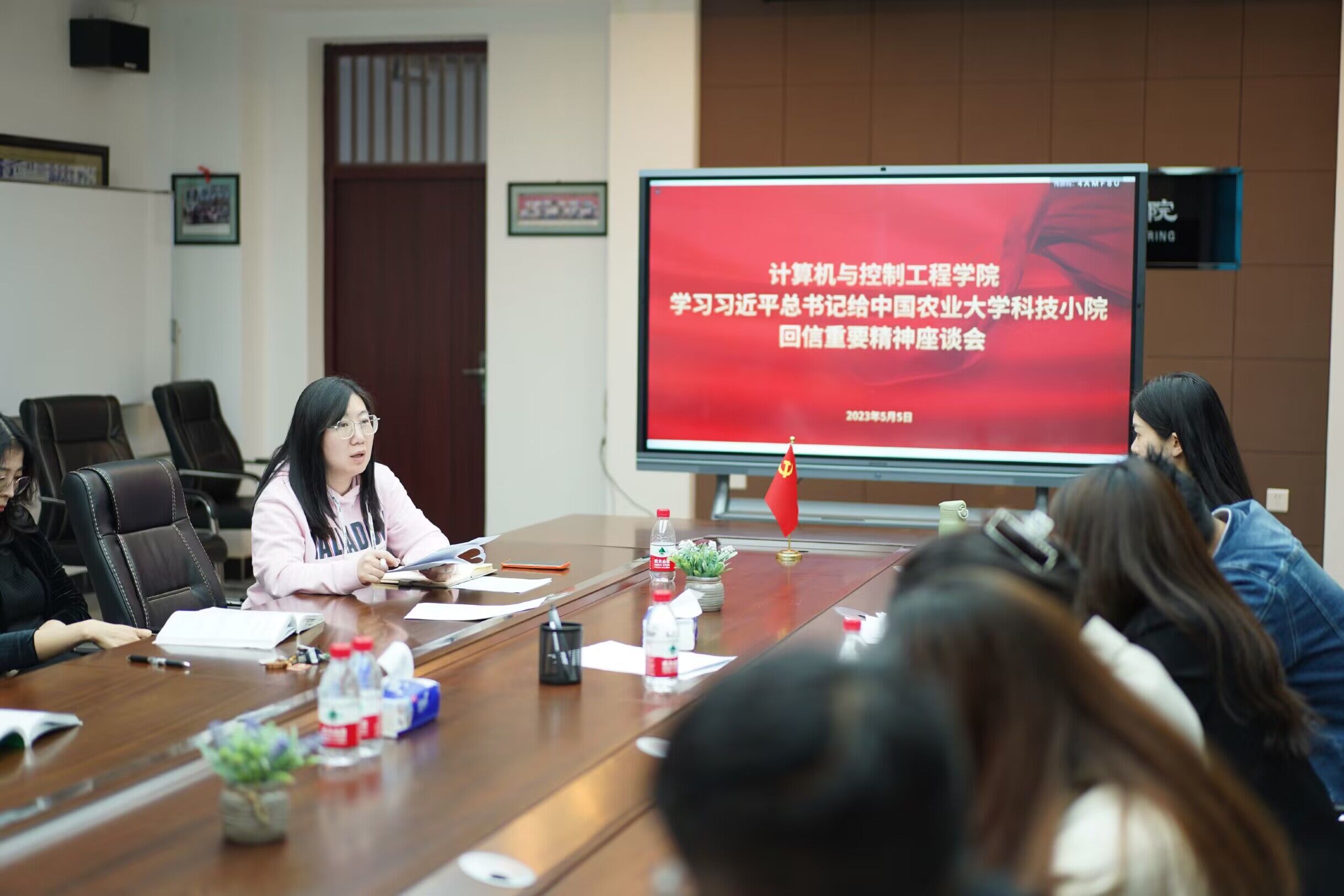 为深入学习贯彻习近平总书记给中国农业大学科技小院回信重要精神,根据学校《学习贯彻习近平新时代中国特色社会主义思想主题教育工作方案》中关于理论学习的相关要求,2023年5月5日,计算机与控制工程学院召开学习习近平总书记给中国农业大学科技小院回信重要精神座谈会,学院党委副书记、副院长庄雯培、学院全体辅导员老师出席本次座谈会。