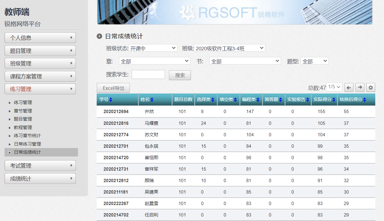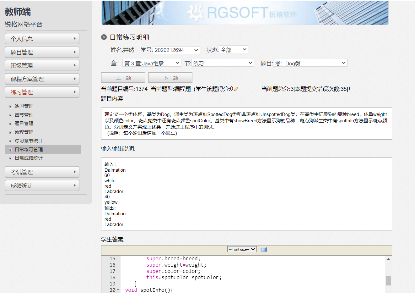 (4)在课后利用学院的瑞格系统,布置相关程序练习题和实验,学生可线上提交代码,系统自动检测和运行代码,并及时提交结果反馈给学生。平台可有效的提高学生编程实践能力,同时根据统计了解学生编程完成情况。