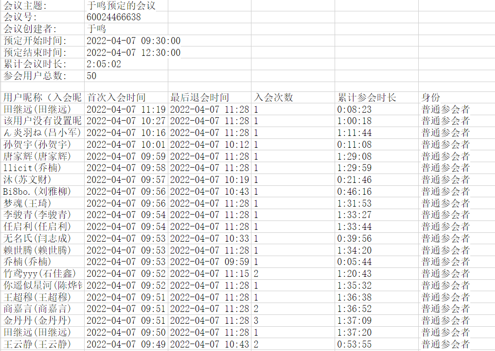 (2)分解课堂知识点,注重学生获得感。利用腾讯会议进行授课直播,直播时要注意知识点讲解过程中的目标明确,思路清晰。在课堂上利用腾讯投票功能进行知识点答题交互,利用直播间留言功能进行课堂问题交互;也可以与学生语音直接交流。课后导出会议参会情况,分析学生听课情况。