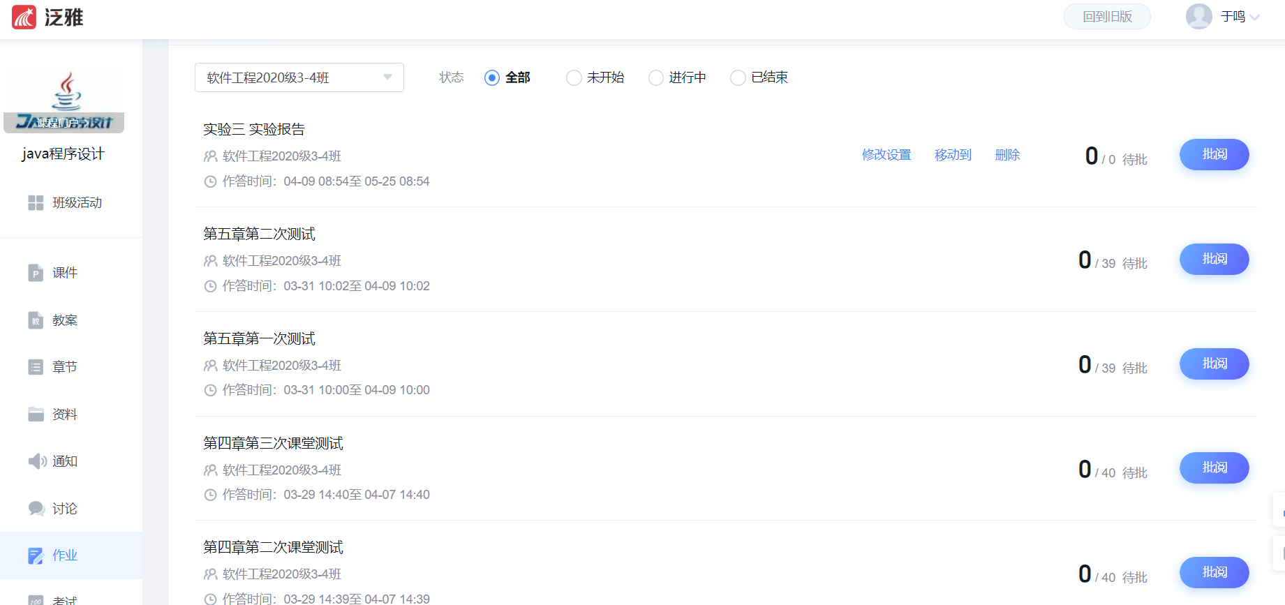 Java程序设计课程是Java系列课程的先修课,课程主要培养学生面向对象的编程思想和编程实践的能力。受疫情影响,本门课程从第3周开始改为线上授课方式。在线上授课过程中能运用信息技术透析整体线上教学过程,分析数据诊断学情,做到教学心中有“数”,同时在教学过程中依据学情及时优化教学方案,控制好线上教学课堂容量;追踪个案,分析差异,激发学习动力,落实个性分层教学;加强单元测试与作业等考核环节的设计,做到及时有效的作业反馈。确保疫情期间教学活动有质量的开展。