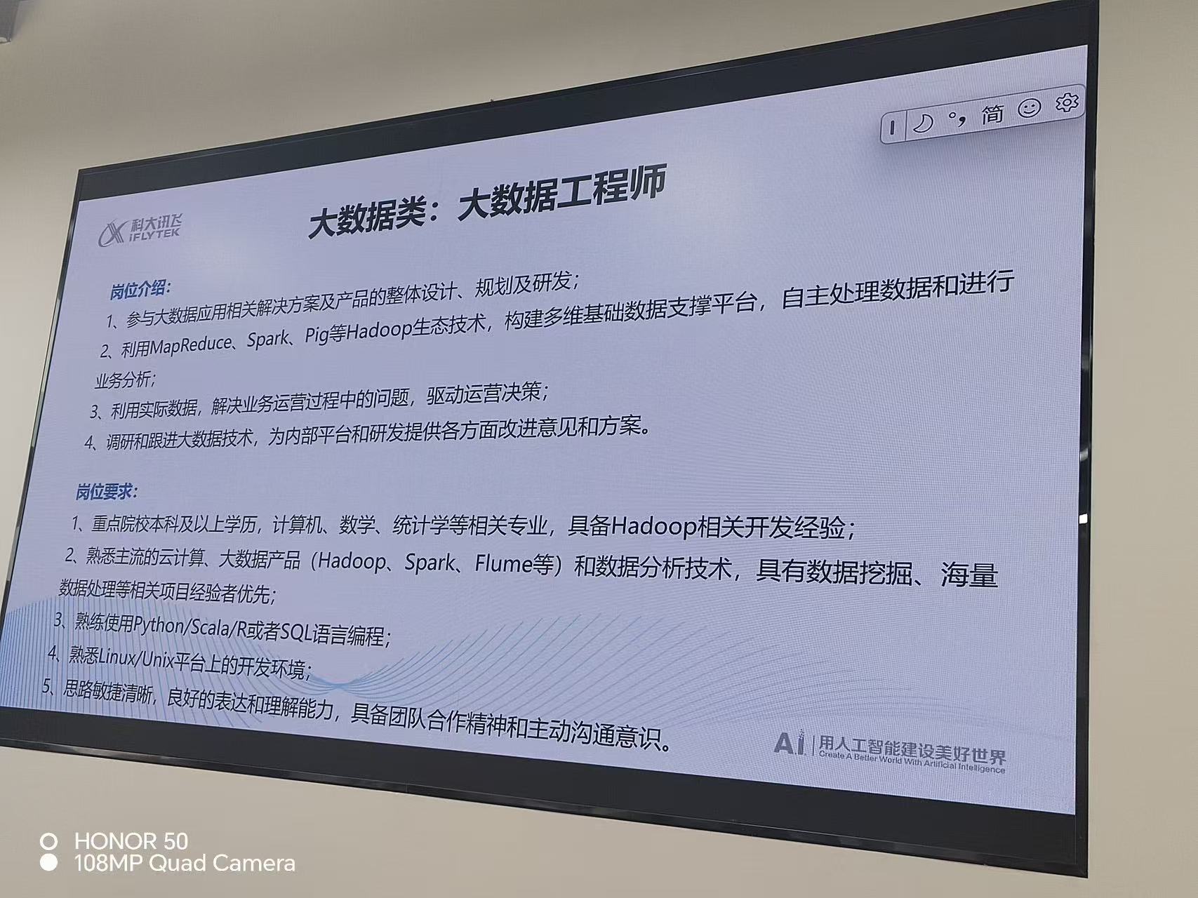 在黑龙江讯飞人工智能研究院,同学们聆听了一场以 “大数据与人工智能技术应用前景、职业方向与就业案例” 为主题的精彩报告。报告中,专家详细阐述了大数据与人工智能技术在当今时代的广泛应用领域,如智能医疗、智慧城市、金融科技等,并深入分析了这些领域所衍生出的丰富职业方向,包括数据分析师、人工智能工程师、算法专家等。通过一个个真实生动的就业案例,同学们直观地了解到不同职业路径所需的技能与素养,以及在实际工作中可能面临的挑战与机遇。