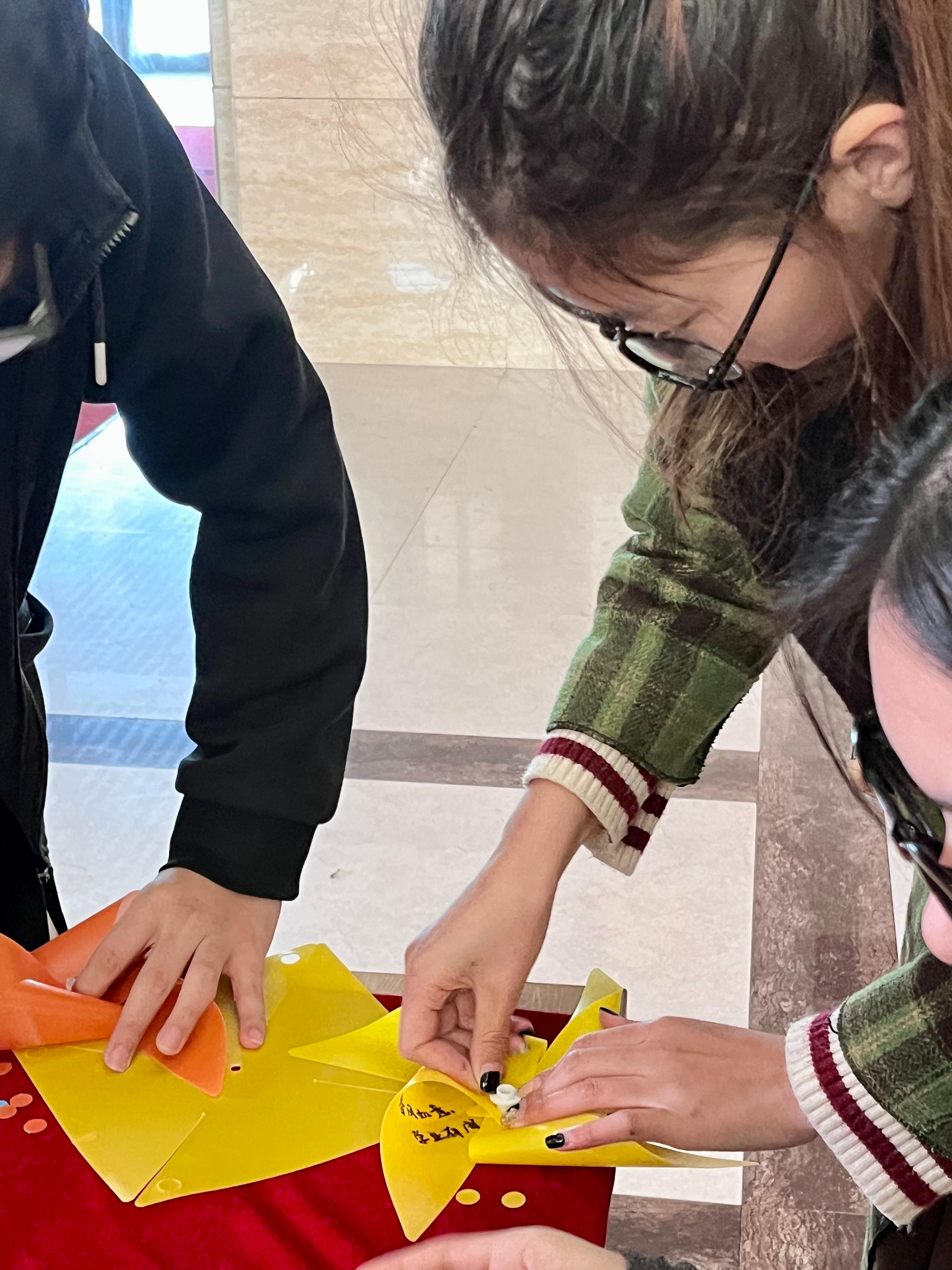 春风缠绵,思念悠悠。风车是思念的载体,思念也是生命的桥梁,同学们将思念托付于风车,将情感涌现于文字中,这是人们在漫长的时间长河里的自我疗愈,是情感的生生不息,更是爱的世代流传。活动结束后。同学们将风车悬挂在展示墙上、插在校园花丛中,微风拂过,风车摇曳,思念好像也有了声音。