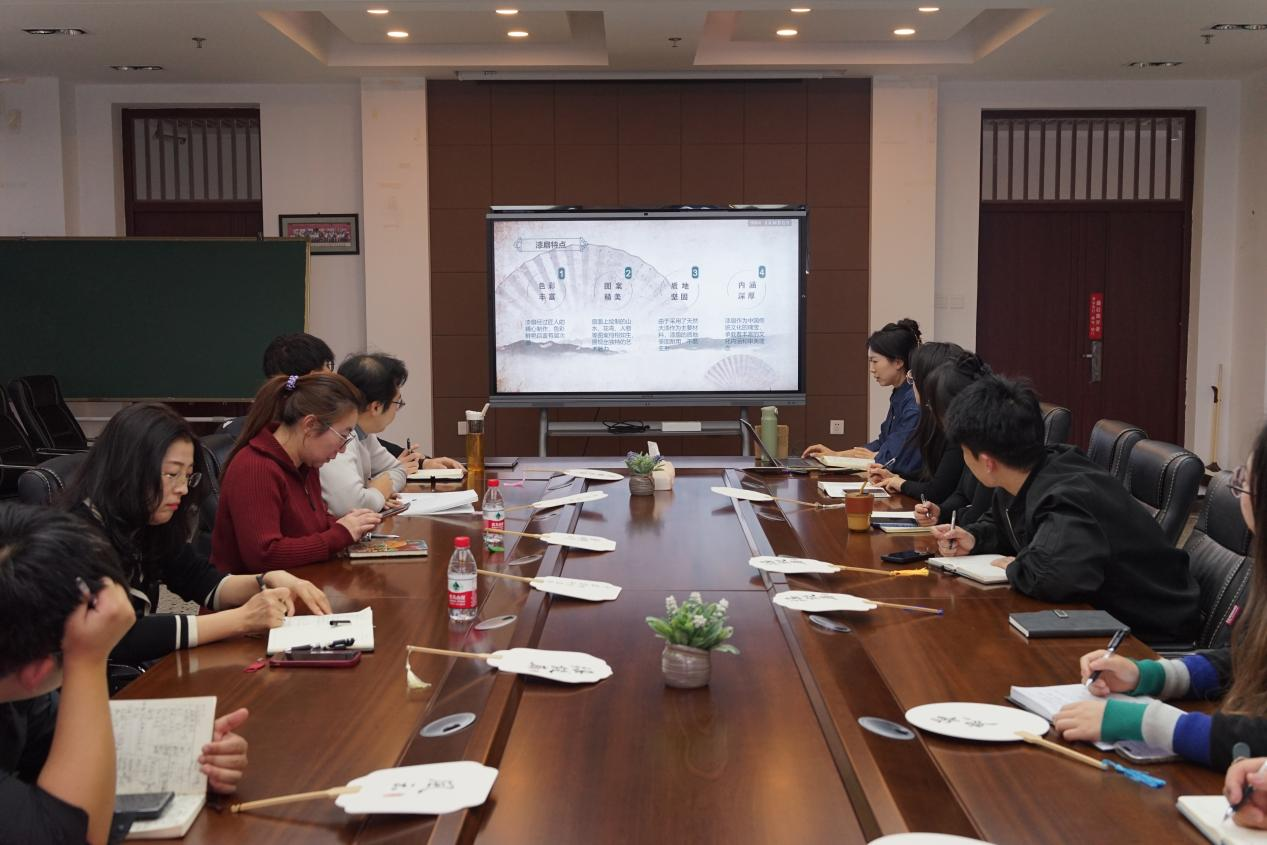 活动伊始,夏梦简要介绍了举办此次沙龙的初衷,非遗文化作为中华民族瑰宝,蕴含着深厚的历史底蕴和育人价值,而漆扇作为其中独特的艺术表现形式,值得深入了解与传承。随后,夏梦详细讲解了非遗漆扇的历史渊源、传承价值以及制作工艺。