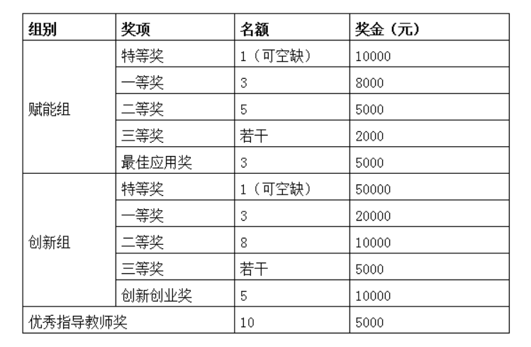 通过对参赛项目的综合评选,按赋能组和创新组分别评选出区域一、二、三等奖并颁发相应证书,获奖团队总数量不超过该区域提交有效作品队数的三分之一。在复赛(区域选拔)基础上选送不超过50支参赛队伍进入全国总决赛。